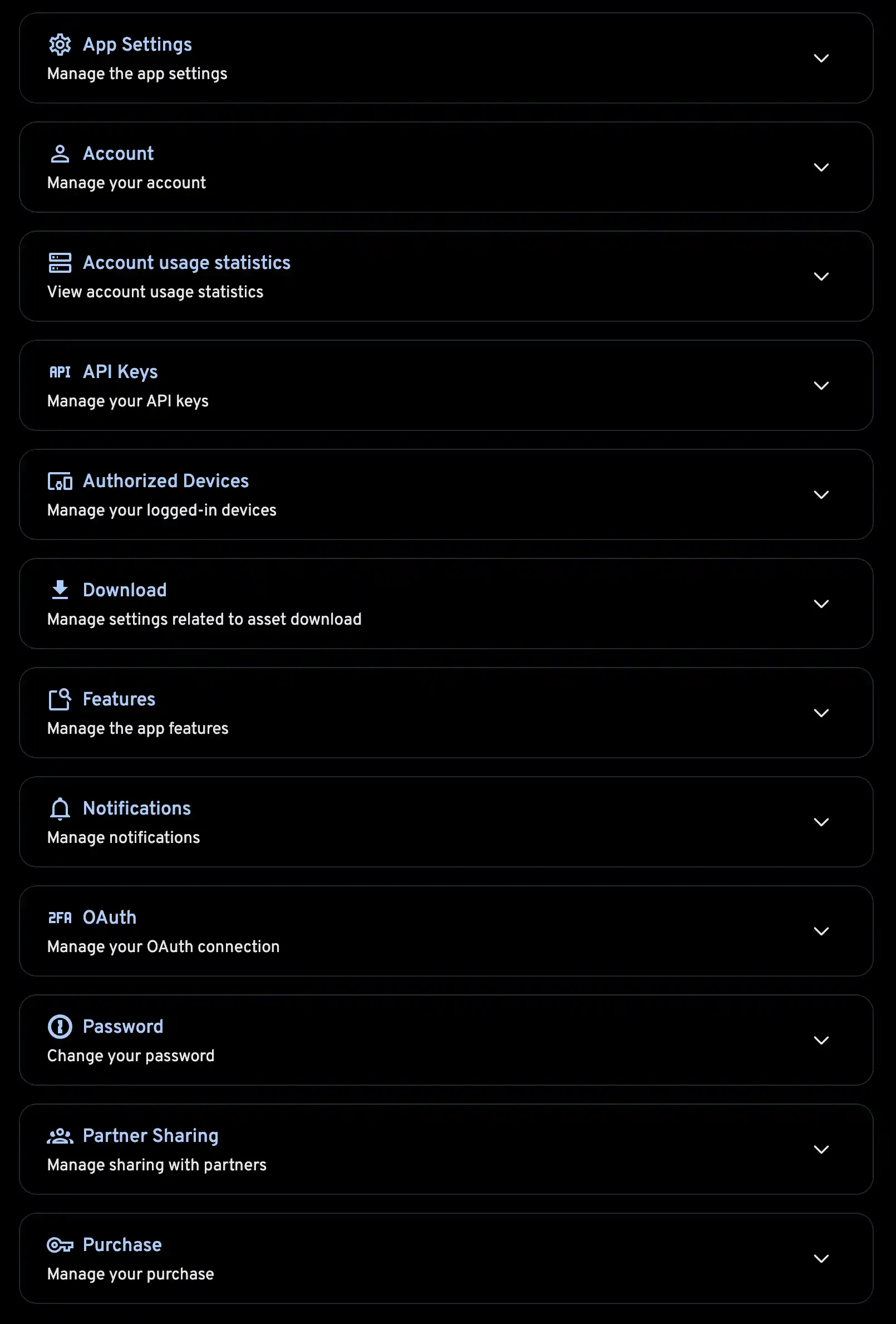 Immich gives each user the ability to manage their own settings. This includes being able to update their profile, toggle certain feature, generate API keys, manage the logged in devices, a view of account usage statistics, and more.
